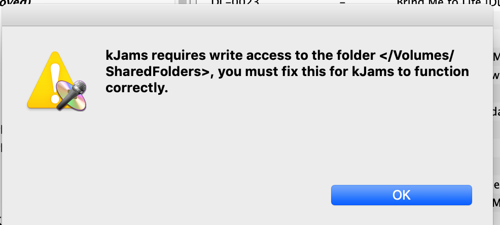 kJams requires write access to the folder </Volumes/SharedFolders>, you must fix this for kJams to function correctly.
